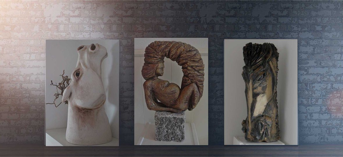 Sonia Vicari Polli, opere dedicate sia agli equini, sia all’umanità. In legno, un muso di cavallo con la criniera ritta e gli occhi malinconici, persi in un misterioso nulla; opposta una zampa nodosa, inquietante nella sua immobilità. Altre creazioni in ceramica, legno e rame: animali in movimento. Il primo, bianco con una ferrea cresta e lunghe zampe, sembra lanciarsi al galoppo; l’altro, color ruggine con sfumature nere, pare eseguire una misteriosa danza. Le sculture dedicate all’umanità, realizzate in pietra (alabastro di Volterra) rappresentano sia una mano, sia una figura femminile dai lunghi capelli e dal volto esoterico: forse fata, forse dea. Nei quadri materici la sperimentazione dei colori suscita un senso di libertà interpretativa.